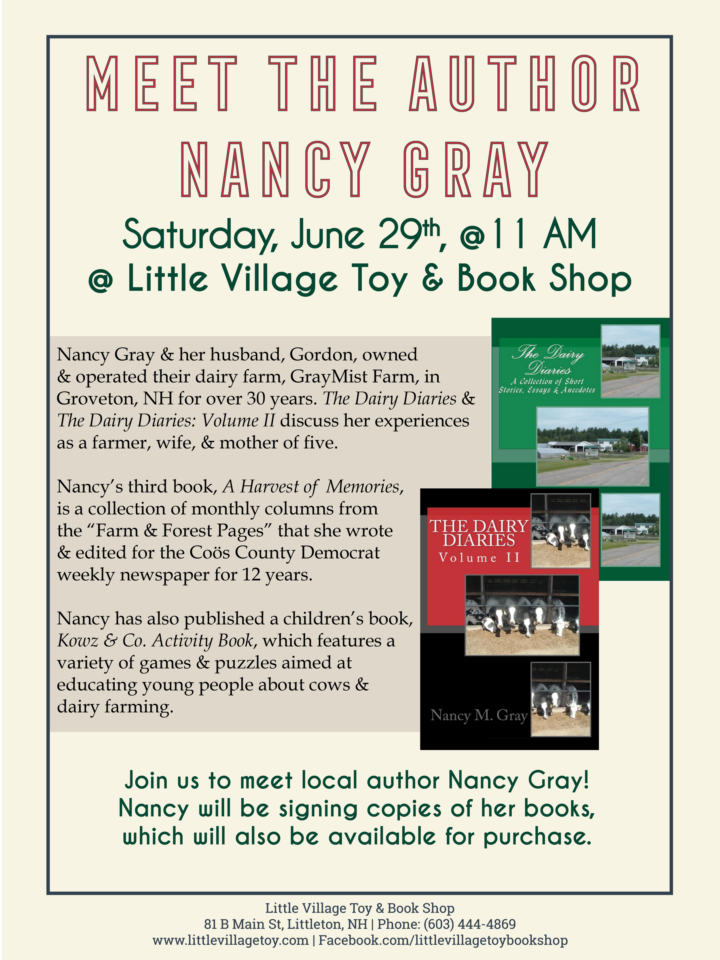 Join us Saturday, June 29th, at 11 AM to meet Nancy Gray! Nancy will be available to meet here at Little Village Toy & Book Shop, and will be signing copies of her books, which will also be available for purchase.