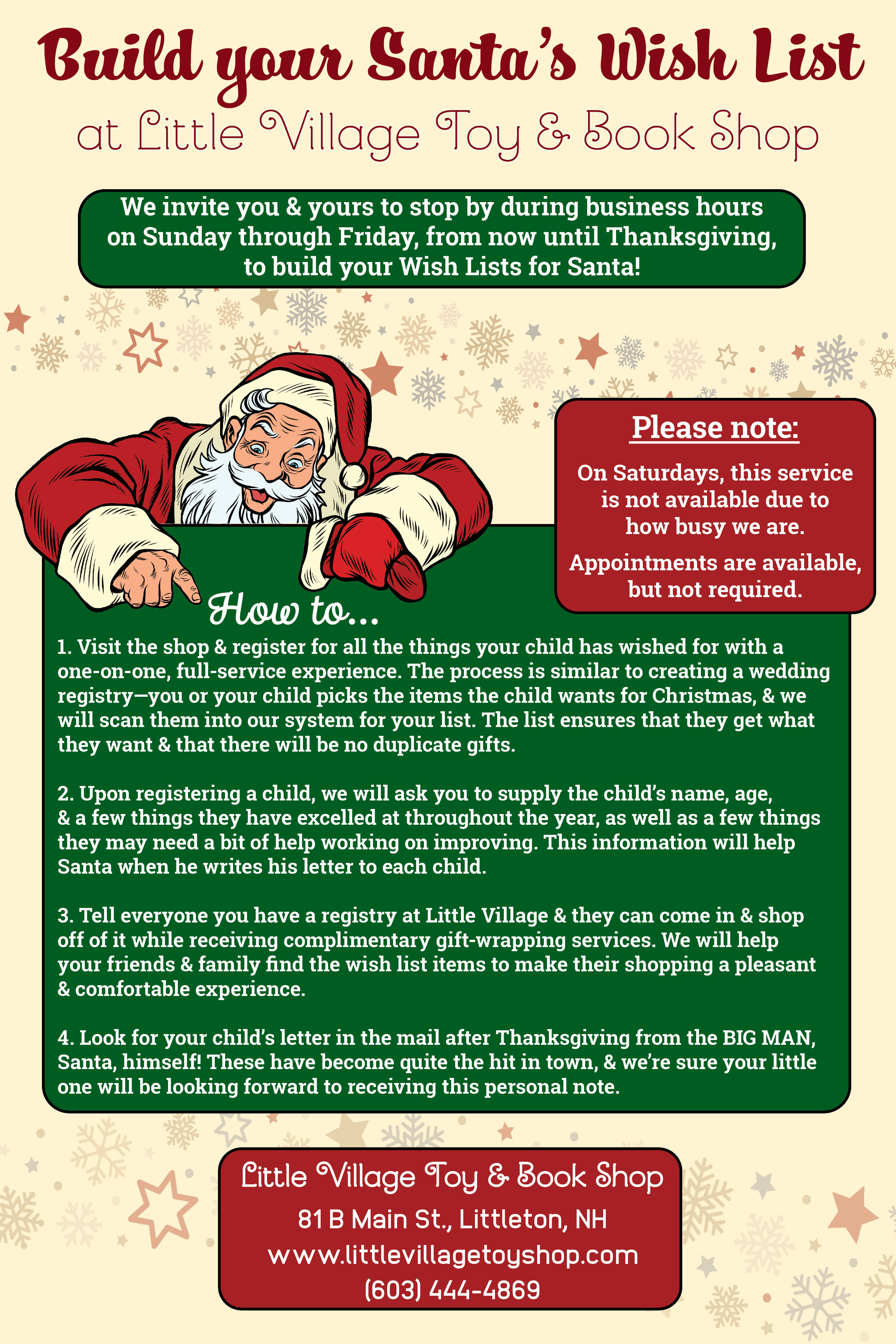 It's that time of year again – Santa's Wish List is back! From now until Thanksgiving, the Little Village team is here to help you and your children build their wish list with a personal shopping experience.