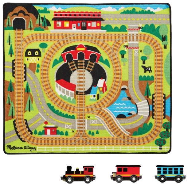 • All aboard for some railroad adventures with this sturdy, colorful train rug! Durably made to look great for countless playtimes to come, the woven rug with a skid-proof backing comes with three connectable wooden train cars and features details like tracks, a train station, switching yard, roads, railroad crossings, and more to accommodate all kinds of vehicles, play people, and more! With this rug, there are lots of ways to learn and play.